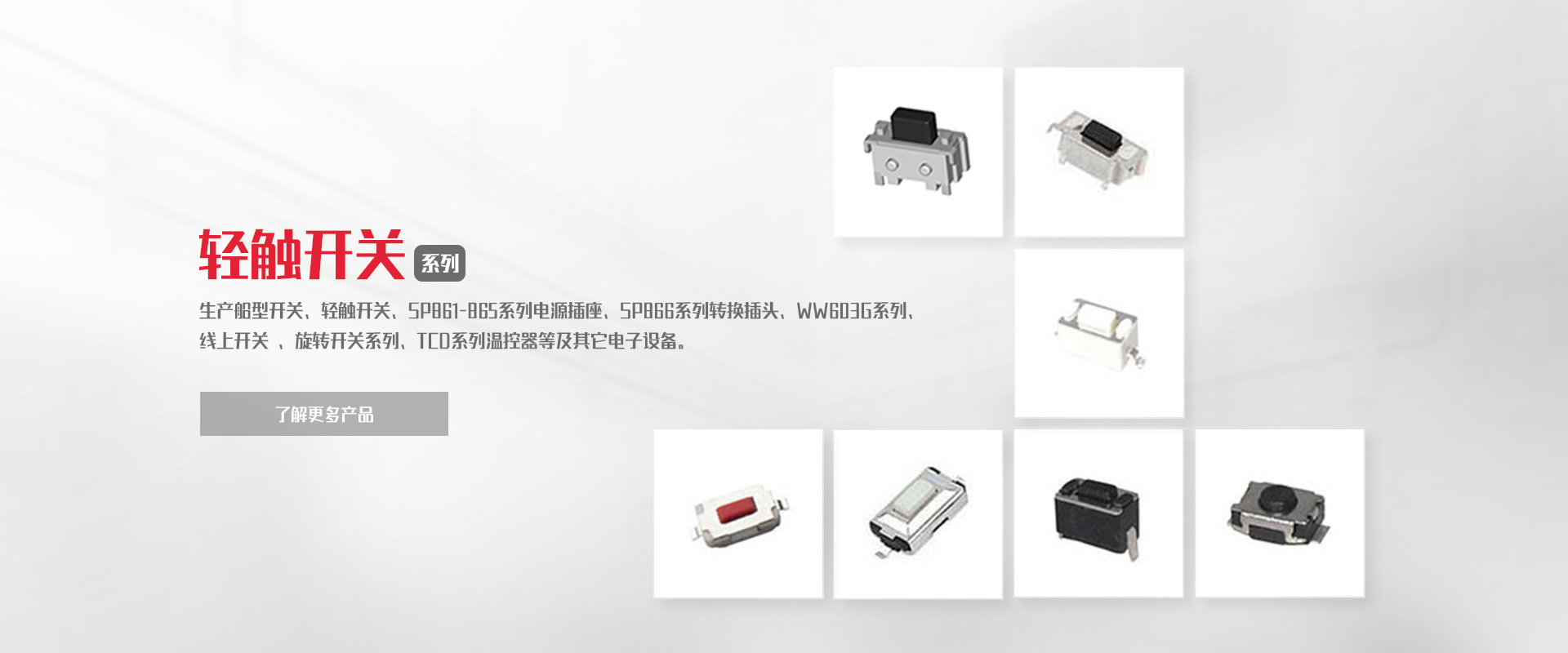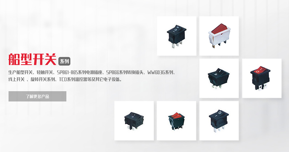 公司专业生产船型开关、轻触开关、SP861-865系列电源插座、SP866系列转换插头、WW11系列微动开关、WW01-03、09系列按钮开关DS、WW系列指示灯开关、WW603G系列 线上开关 、旋转开关系列、TCD系列温控器等及其它电子设备。