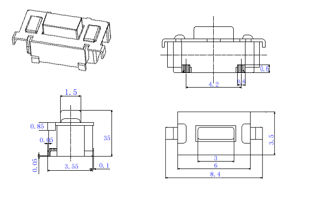 型号规格:TS3635系列中文命名:3*6*3.5贴片支架无定位轻触开关