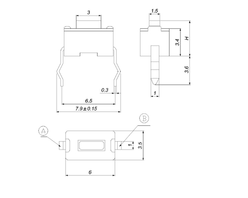 |  | | 型号规格:TS36H系列 | 中文命名:3*6-插脚型轻触开关 |