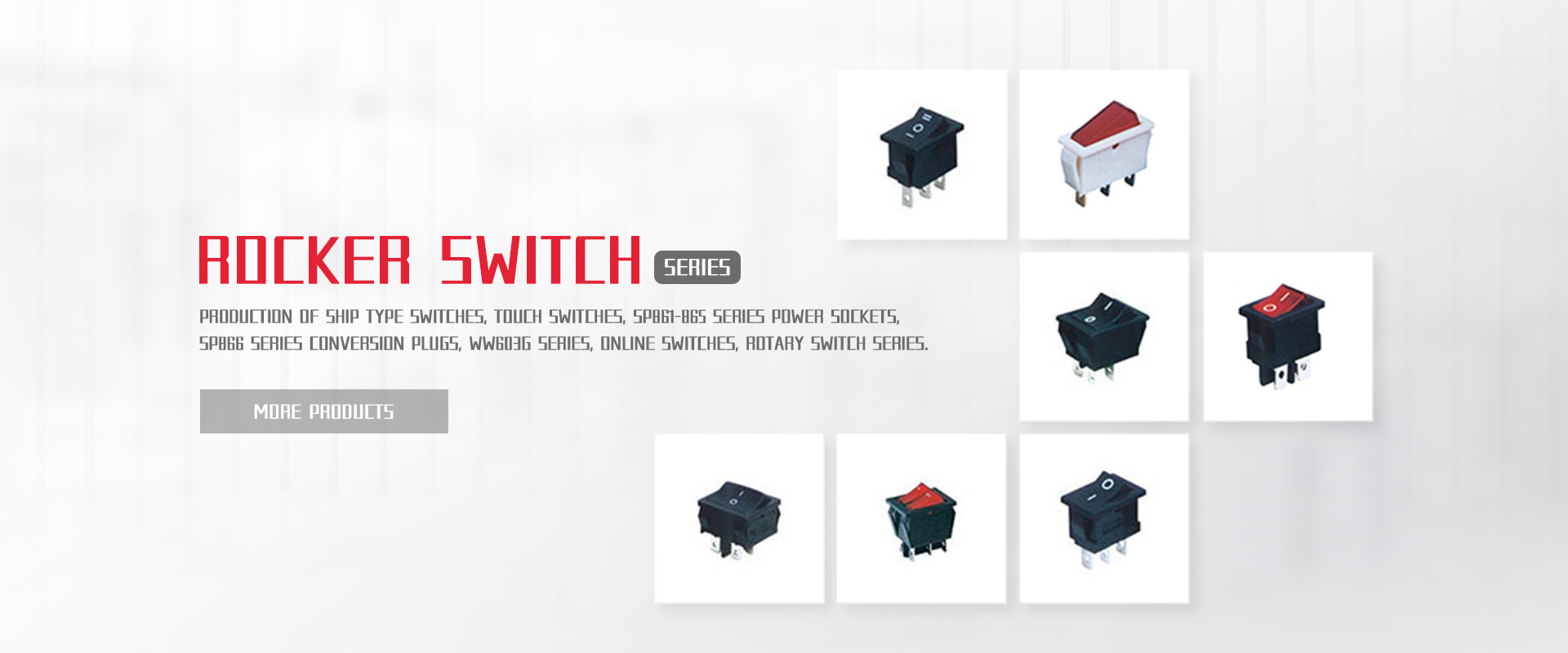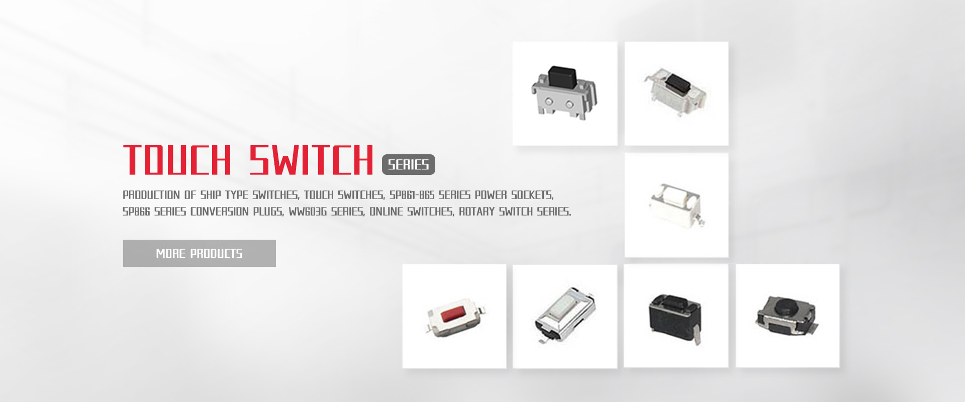 The company specializes in the production of ship switches, touch switches, SP861-865 series power sockets, SP866 series conversion plugs, WW11 series fretting switches, WW01-03, 09 series button switches DS, WW series indicator switches, WW603G series & nbsp; online switches & nbsp;, rotary switches series, TCD series thermostats and other electronic equipment.