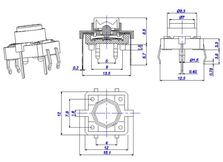 |  | | 型号规格:TSD1265系列 | 中文命名:12*12带灯型按钮 |